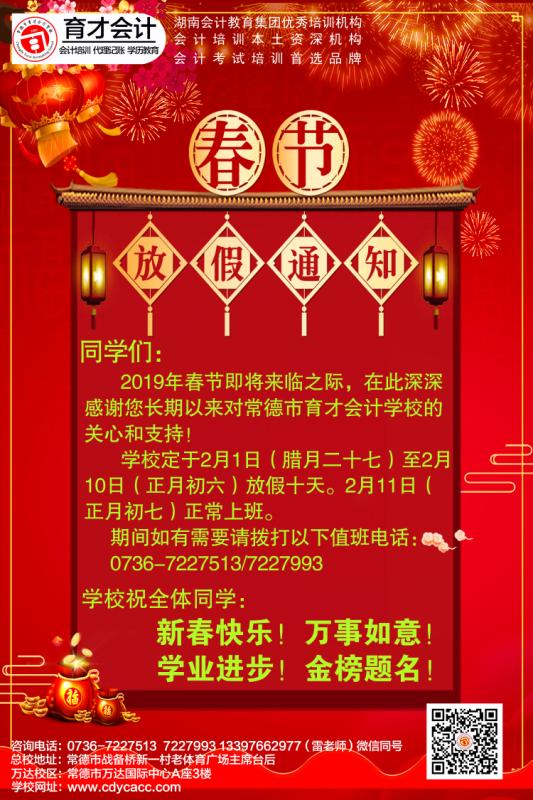 2019年春节即将来临之际,在此深深感谢您长期以来对常德市育才会计学校的关心和支持!
