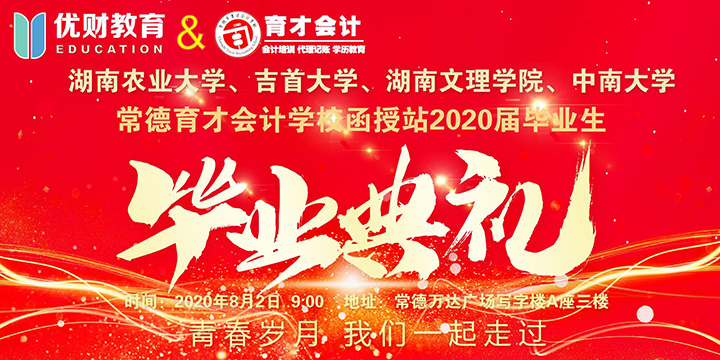 2018级常德育才函授站全体专科、专升本的同学们 学校于2020年8月2日在万达广场写字楼A座三楼育才会计学校分校举行2018届毕业典礼,共话师生和同学情谊,分享同学成功喜悦,共同交流职业发展成功经验。 诚邀同学们按时参加届时一起共进午餐!