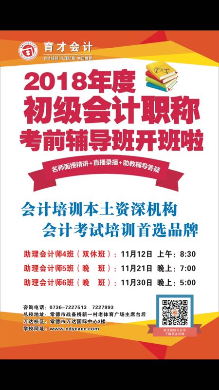 2018年初级会计师培训班双休班4班于11月12日上午八点半开班、晚班5班将于11月21日晚七点开班、晚班6班将于11月30日晚五点开班,学校要求严格化,课程多样化,内容全面化,考试简单化,通过率高。有需要的学员可电话联系0736--7227513/7227993